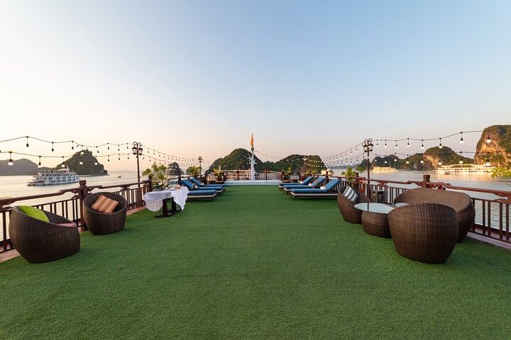 With a long route discovering unspoiled, less crowded spots in the Bay, which is normally designed for 3 day 2 night itinerary only, the cruise offers guests an extraordinary opportunity to enjoy the pristine beauty of Halong Bay to the fullest. A highlight of Cruise’s itinerary is visiting Sung Sot Cave, the largest and most beautiful cave in Halong Bay, where guests can take the chance to admire thousand-year-old stalactites. Not just a cruise, Cruise strives to provide guests with a memorable night experience in Halong with Gala Dinner on the Sundeck (subject to weather conditions). Our cruise also offers free herbal bags and foot bath basin for relaxation on the Sundeck after a meal.